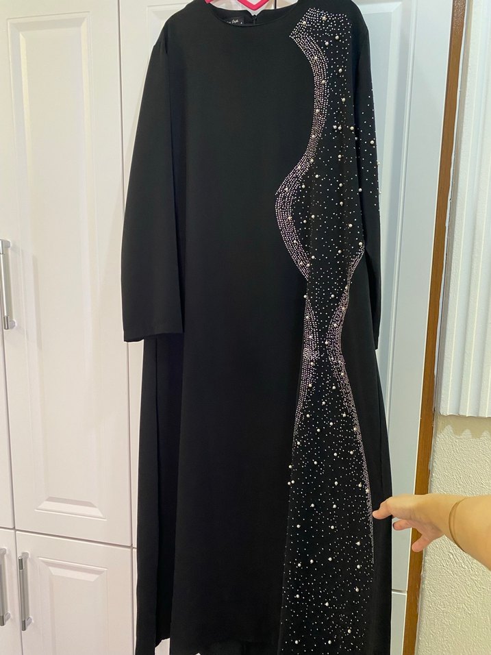 Siyah renkte, uzun kollu ve bisiklet yaka olan bu uzun elbise, payetli desenli detaylara sahiptir. Sentetik kumaştan yapılmış, rahat kesim ve mütevazı, gösterişli gotik stile uygundur. ✨
