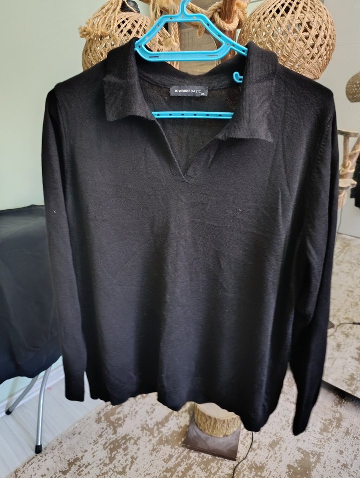 Siyah renkli, uzun kollu ve polo yakalı kadın kazak. Rahat kesimi günlük rahat stil için uygundur. Yumuşak