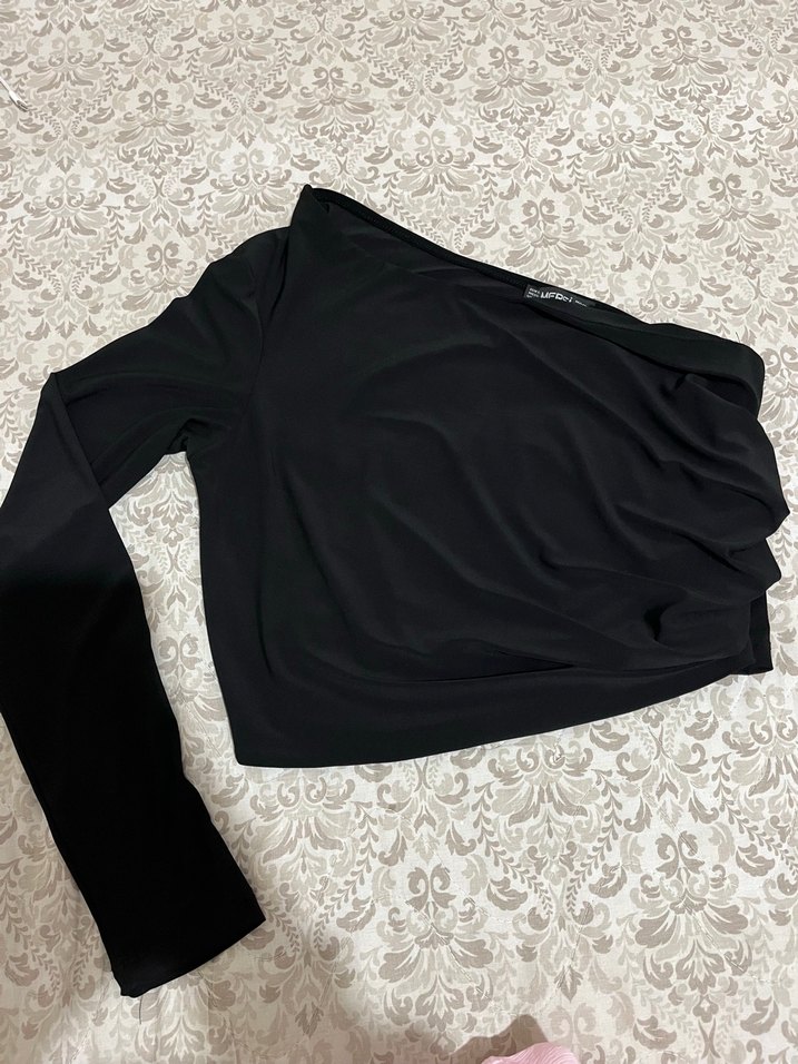 Bu siyah bluz, uzun kollu ve kayık yaka tasarımıyla drapeli, salaş ve midi boydadır, günlük kullanım için uygundur.
