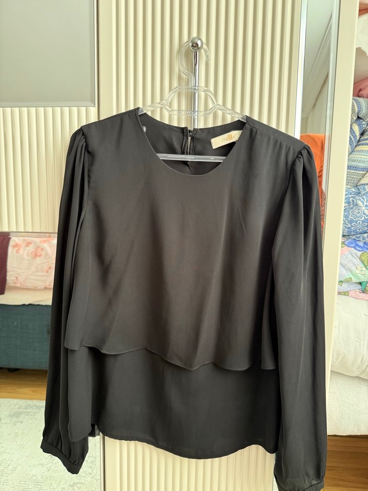 Siyah, uzun kollu ve yuvarlak yaka olan bu bluz, salaş kesimi ve dökümlü tasarımıyla ofis için uygun, minimalist ve çağdaş bir görünüme sahiptir.