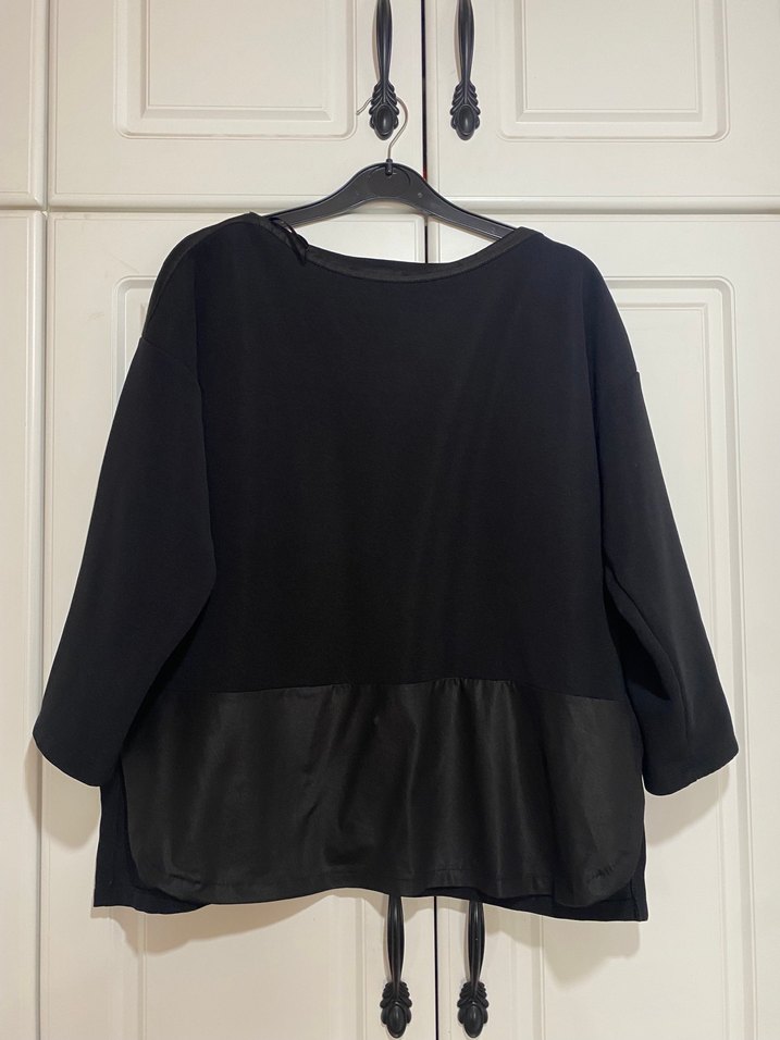 Bu siyah bluz, yuvarlak yaka ve uzun kollu olup salaş bir kesime sahiptir. İpek gibi kumaştan yapılmış olup günlük kullanıma uygun minimal ve zahmetsiz şıklık sunar.
