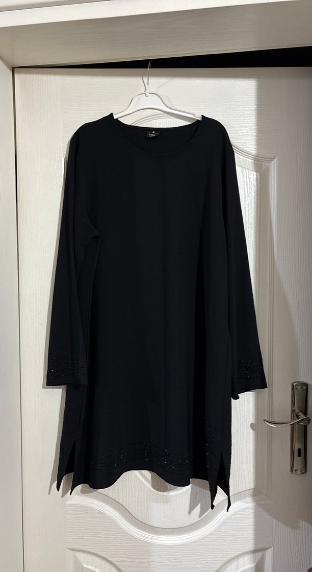 Siyah, uzun kollu, salaş kesim ve yuvarlak yakalı tunik. Dökümlü yapısı ve desen içermeyen tasarımıyla günlük kullanıma uygundur. 90 cm