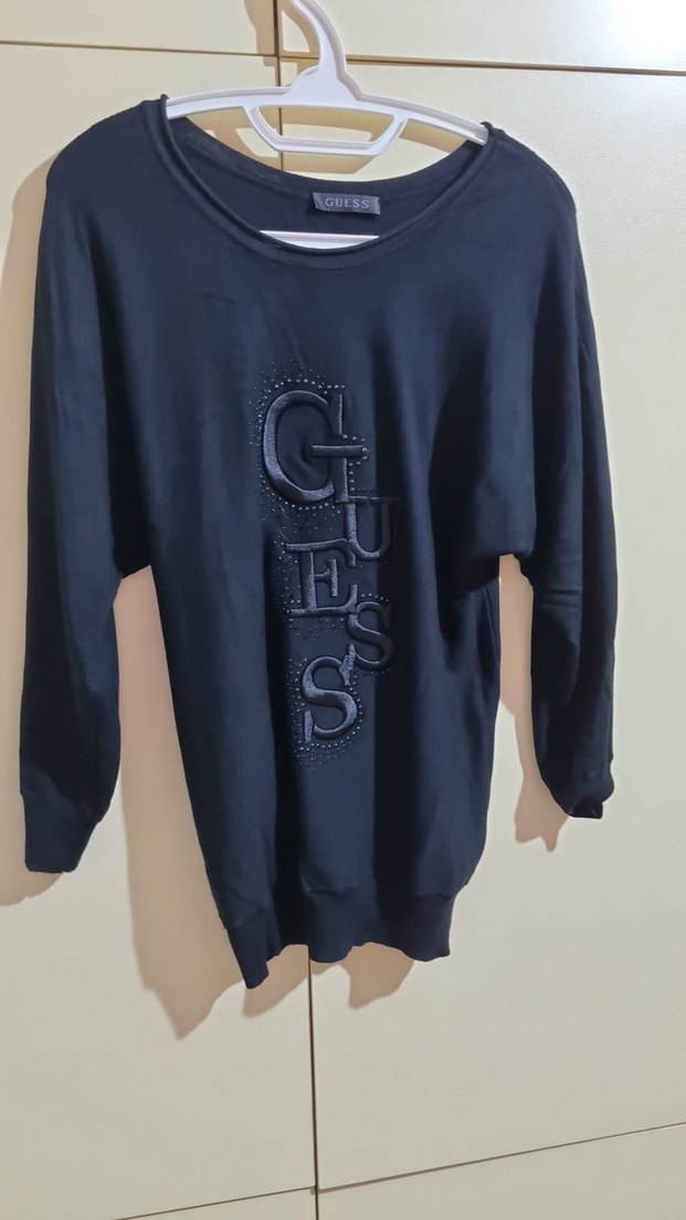 Siyah, uzun kollu, yuvarlak yakalı, bol kesim, örgü detaylı ve baskılı Guess logolu rahat sweatshirt.