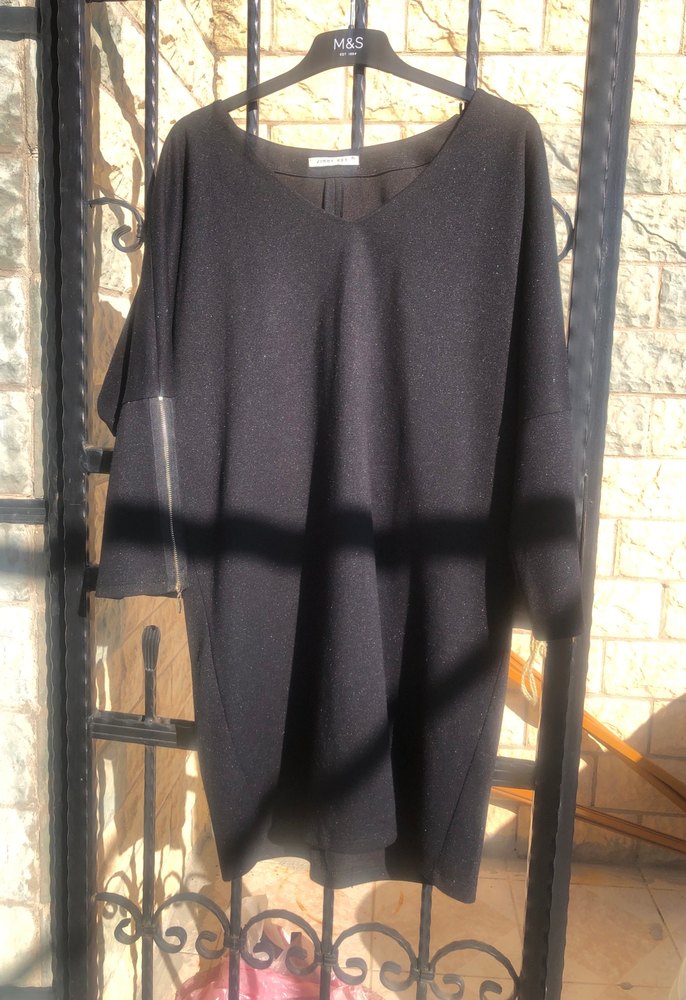 Siyah yün triko elbise, bol kesim, uzun kollu ve bisiklet yaka detaylarıyla günlük kullanıma uygun rahat ve şık bir sokak stili sunar.