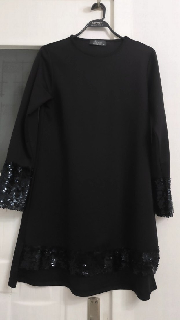 Siyah uzun kollu, bol kesim tunik, kol ve etek uçlarında fırfır ve payet detaylarıyla gotik parti tarzı için uygundur.