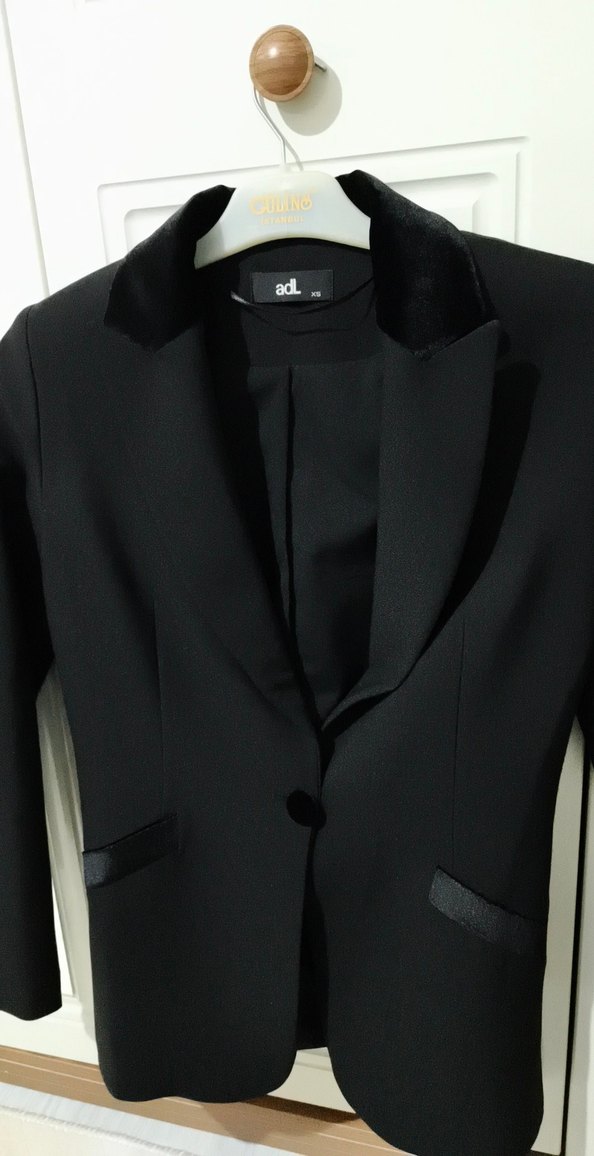 Siyah renkli, ipeksi dokulu, düğmeli ön kapamalı, uzun kollu ve uzun boylu kadın ceketi. Ofis kullanımı için klasik şıklık sunar.