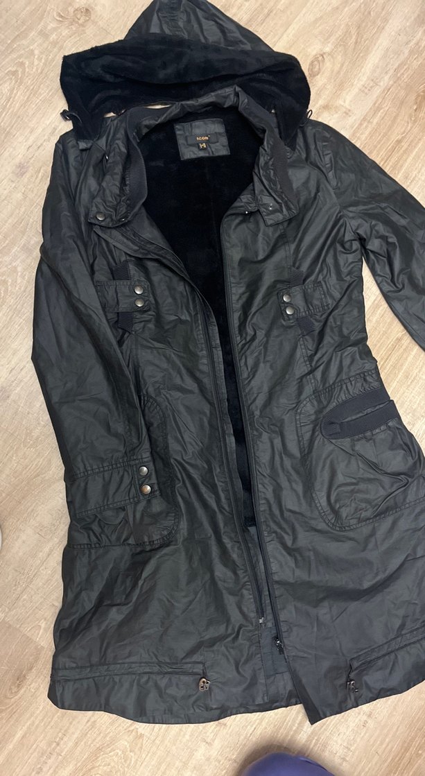 Siyah, uzun boy, kürk detaylı kadın ceketi. Sentetik kumaştan ve regular fit kesimlidir. Notched lapel yaka ve uzun kolludur, outdoor için uygundur.