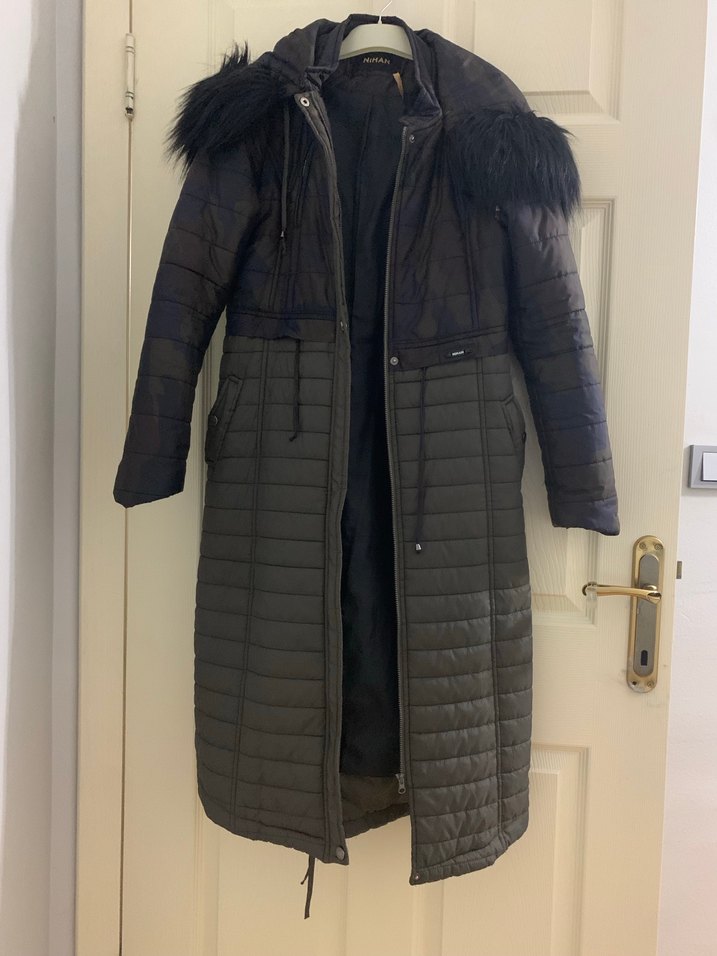 Siyah renkte, sıvı geçirmez kürklü detaylı kapüşonlu ve kesimli uzun kaban. Yumuşak ve sıcak kumaştan, çıtçıtlı cepler ve kayışlı kollara sahip, rahat ve şık sokak stili. Kolunda çok küçük çizik vardır resimde görüldüğü gibi yırtık değildir.