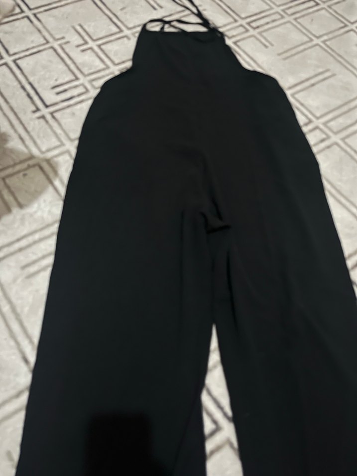 Siyah, bol paça kadın tulum, yumuşak sentetik kumaştan ve . Minimalist sokak stili, günlük kullanıma uygundur.