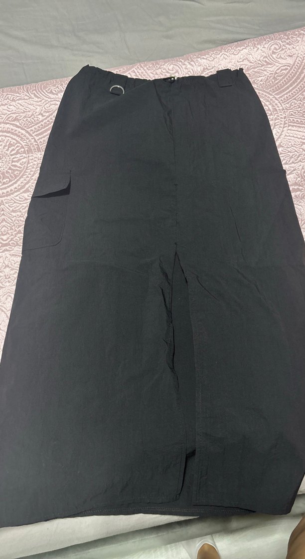 Siyah uzun paraşüt etek, bol kesim ve ön yırtmaç detaylı S-M bedendir .