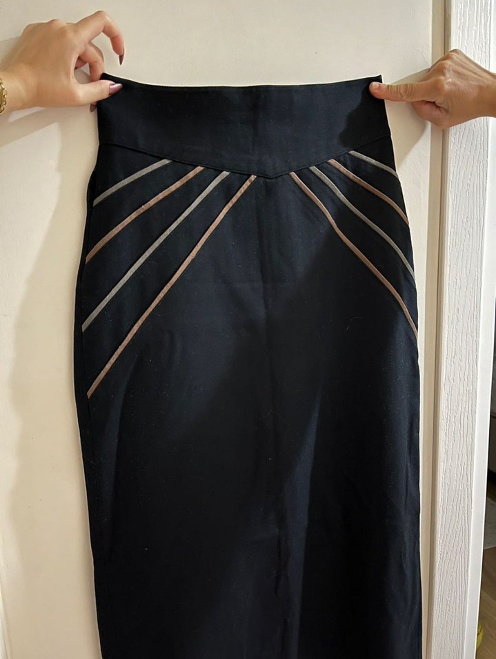 Siyah uzun etek, vücuda oturan kesimi ve pilili detayları ile dikkat çeker. Sentetik kumaştan üretilmiş, ofis için uygun gotik tarzda.