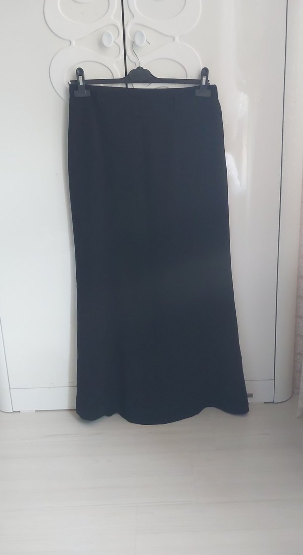 Siyah renkte, salaş kesimli ve drapeli uzun etek. Düz, sentetik kumaştan üretilmiş olup ofis kullanımı için uygundur.