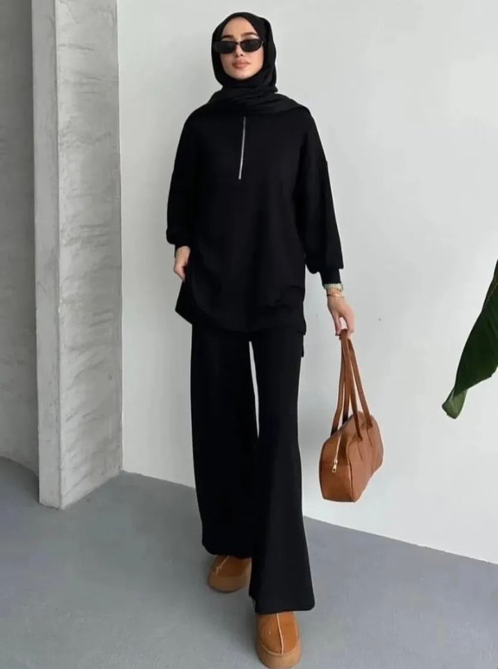 Siyah uzun kollu, yüksek yakalı, salaş kesim kadın takımı. Minimalist ve günlük şıklık sunar. ✨