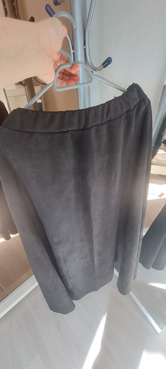 Siyah renkte, yumuşak süetten yapılmış, bol kesim ve drapeli tasarıma sahip kadın uzun eteği, günlük rahat sokak stili için uygundur.