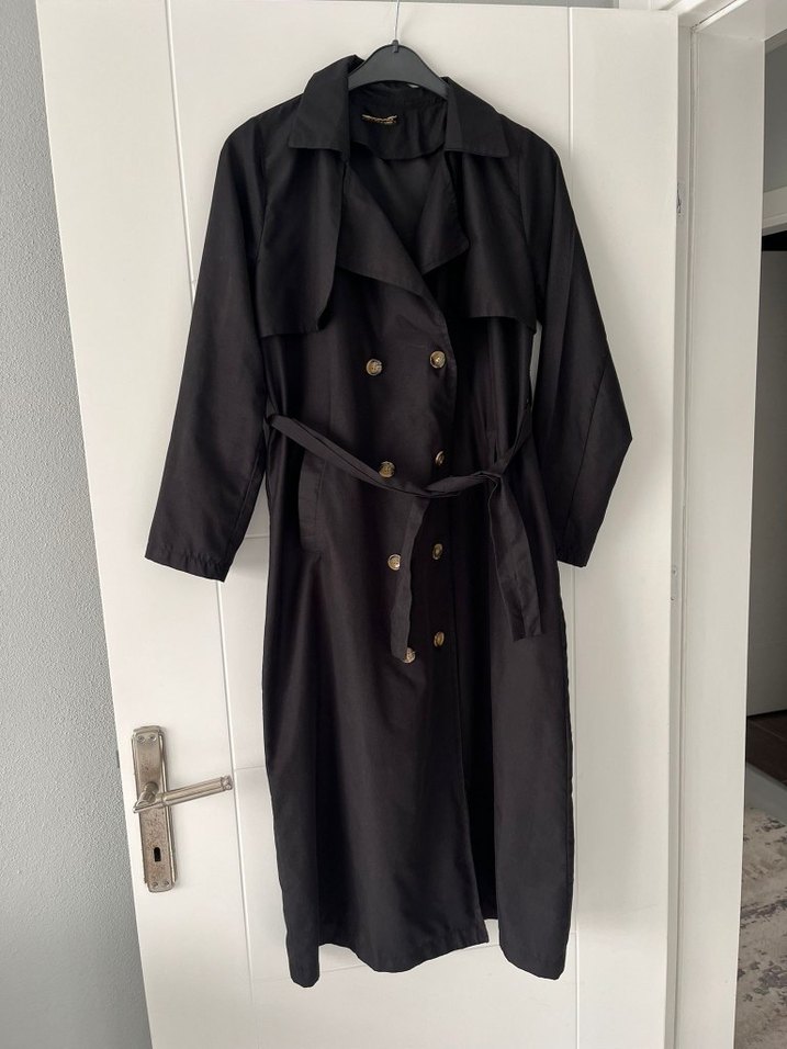 Siyah uzun trench coat, düğmeli önü ve askılı kollarıyla rahat bir kesime sahiptir. Çentikli yaka ve kemer detayı bulunur, yumuşak sentetik kumaştan üretilmiştir.