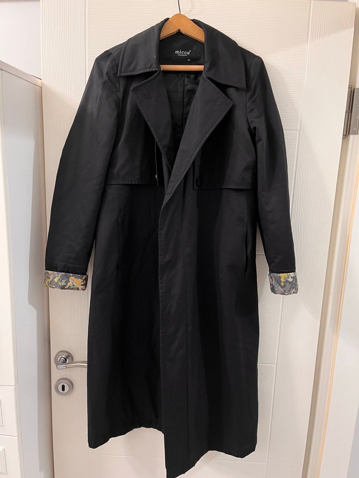 Siyah uzun kadın trenchcoat, kesik yaka ve uzun kolludur. Kemerli, düz kesim ve sentetik kumaştan üretilmiştir, ofis ve sokak stili için uygundur.