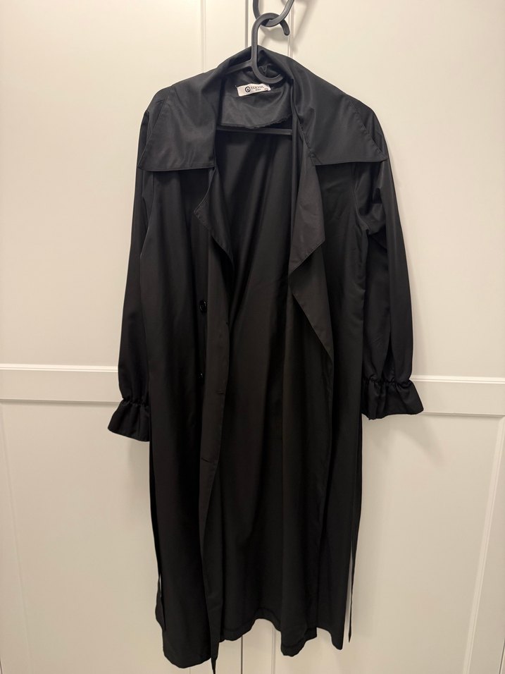 Siyah uzun trençkot, salaş kesim ve yakası açık. Uzun kollu, fırfırlı manşet detaylarıyla ofis stiline uygun şık bir parça.