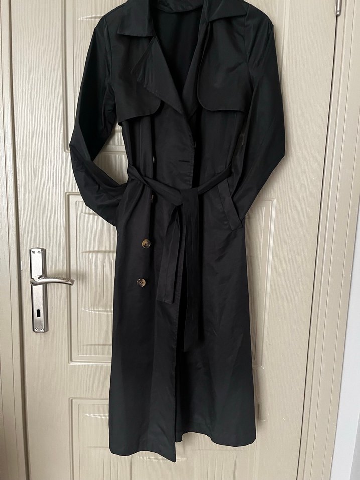 Siyah, uzun, kemerli kadın trençkot. İpek gibi kumaştan, uzun kollu ve desen içermeyen, günlük kullanıma uygun şık bir model.