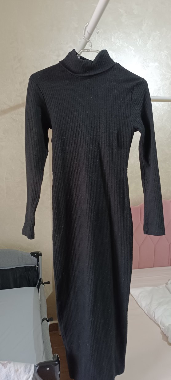 Siyah, triko dokulu, uzun ve vücuda oturan bu elbise; boğazlı yaka ve uzun kolludur. Yumuşak sentetik kumaştan yapılmıştır, günlük kullanıma uygundur.