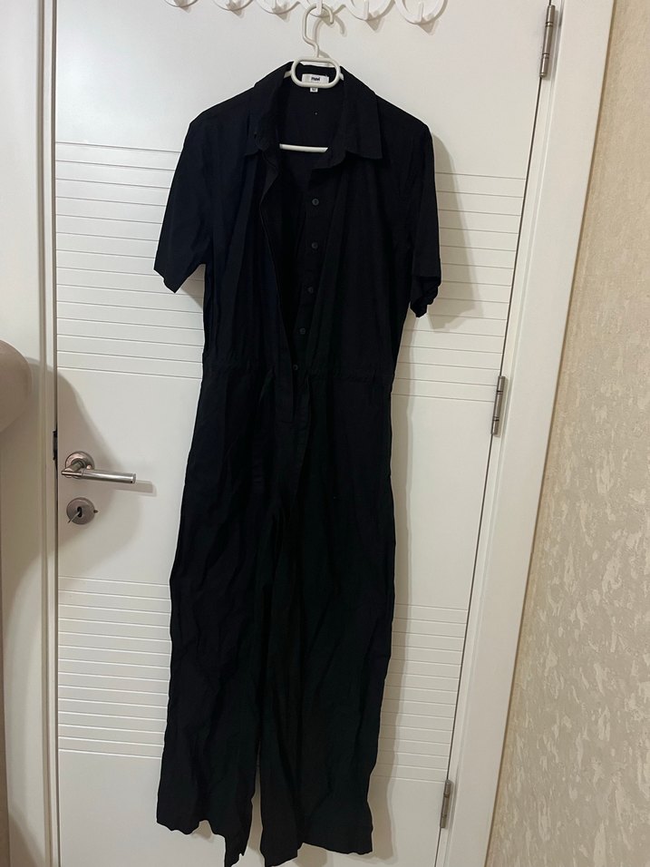 Siyah keten kumaştan, kısa kollu, yakalı ve bol kesim uzun tulum. Minimalist ve rahat günlük kullanım için uygun. Şık ve sade tarz sunar.