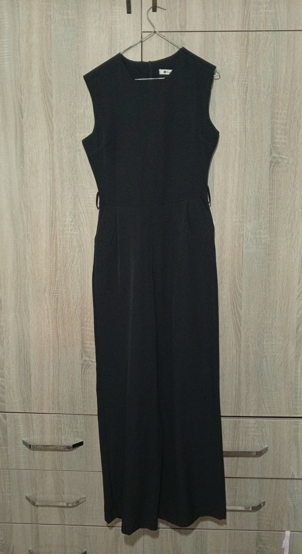 Siyah, kolsuz uzun tulum. Düz, sentetik kumaştan yapılmış. Hiç kullanilmadi.