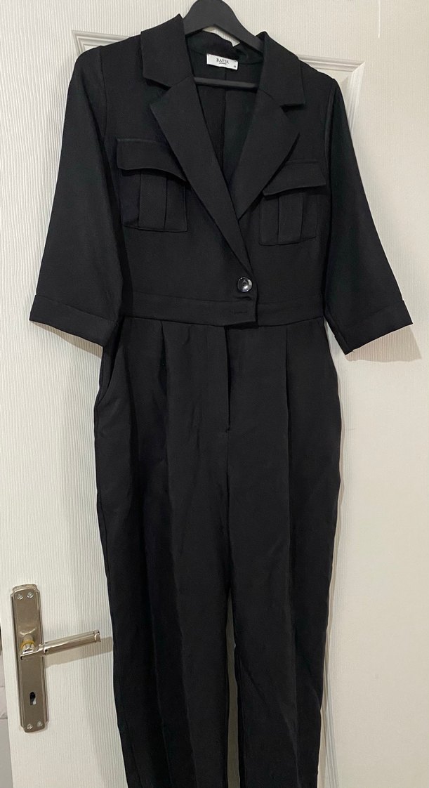 Siyah, kısa kollu, kemerli ve kesimli yakalı uzun tulum. Ofis ve sokak stiline uygun, sentetik kumaş ve düzenli kesimle tasarlanmıştır.