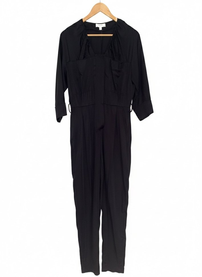 Siyah, kuşaklı bel detaylı, ince askılı, V yakalı uzun kadın tulumu. İnce ve parlak kumaştan, ofis için uygun minimalist tasarım.