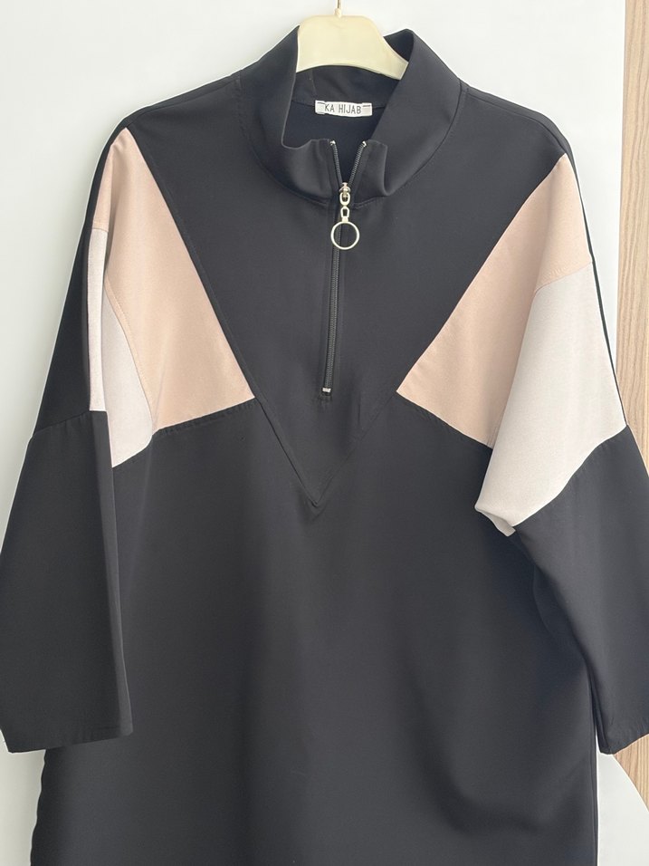 Siyah, baskılı renk bloklu, uzun kol ve yüksek yakalı, fermuar detaylı kadın uzun tunik. Yumuşak sentetik kumaştan, rahat sokak stili için uygun.