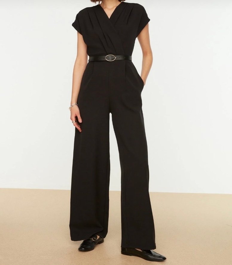 Siyah renkli, V yakalı ve kolsuz uzun tulum. İnce ve ipeksi kumaştan, drapeli tasarımıyla ofis ve şık sokak stilleri için uygun. Omuzdan paçaya 137-138 cm Kemer yeri alındığında da yoktu ama düz bir kemer takılabiliyor.