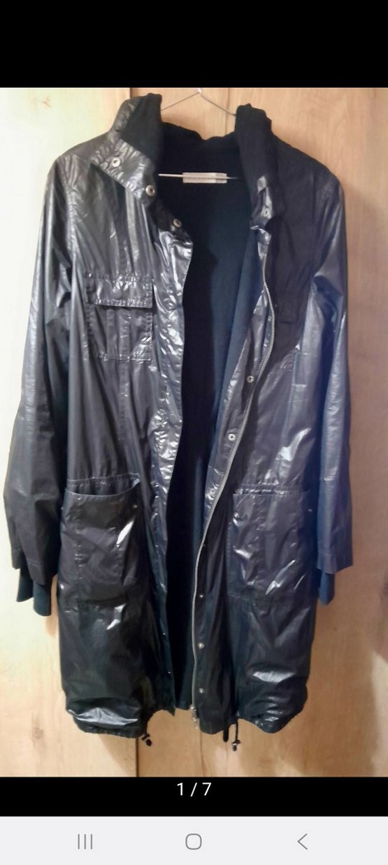Siyah renkli, uzun kesim, fermuarlı yağmurluğu, notched lapel yakalı ve uzun kolludur. Sentetik kumaştan, bol kesim ve günlük sokak stili için uygundur. ️