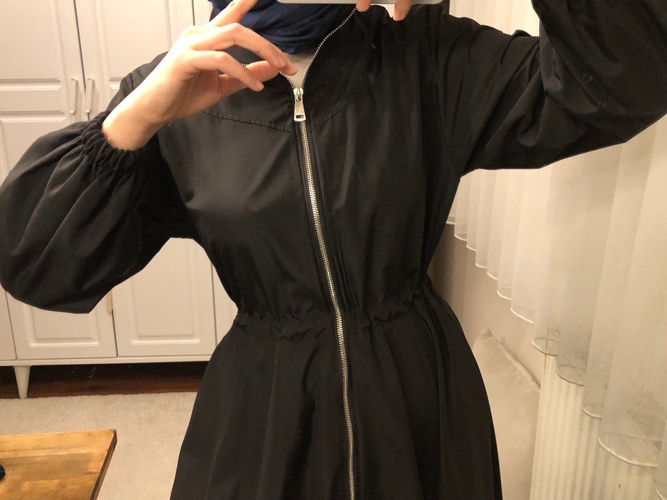 Fermuarlı, yüksek yakalı, parlak siyah sentetik kumaştan yapılmış kadın yağmurluğu. Beli ayarlanabilir daha dar yada çok bol yapılabilir. Strappy kolludur. Yenidir. 3 renk vardır, Haki yeşil, lacivert ve siyah