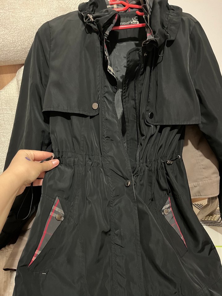 Siyah kadın arka kapatacak uzunlukta, ince kesim, fermuarlı ceket. Uzun kollu, yakasında kesik yaka ve ceplerinde hafif ekoseli detay bulunur. Dış mekan için uygun, sentetik kumaştan.Su geçirmez özelliği vardır.