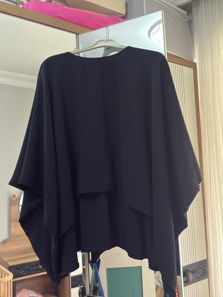 Siyah, uzun kollu, salaş kesim midi boy kadın panço. Drapeli ve crew neck yakalı, ipeksi dokulu, gotik tarzda günlük kullanıma uygun.