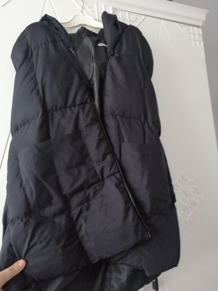 Siyah yelek, yüksek yakalı, fermuarlı ön tasarıma sahiptir. Normal midi boyda, fitted kesim, rahat ve gündelik sokak stili sunar. Gençler için trendy casual tarz.