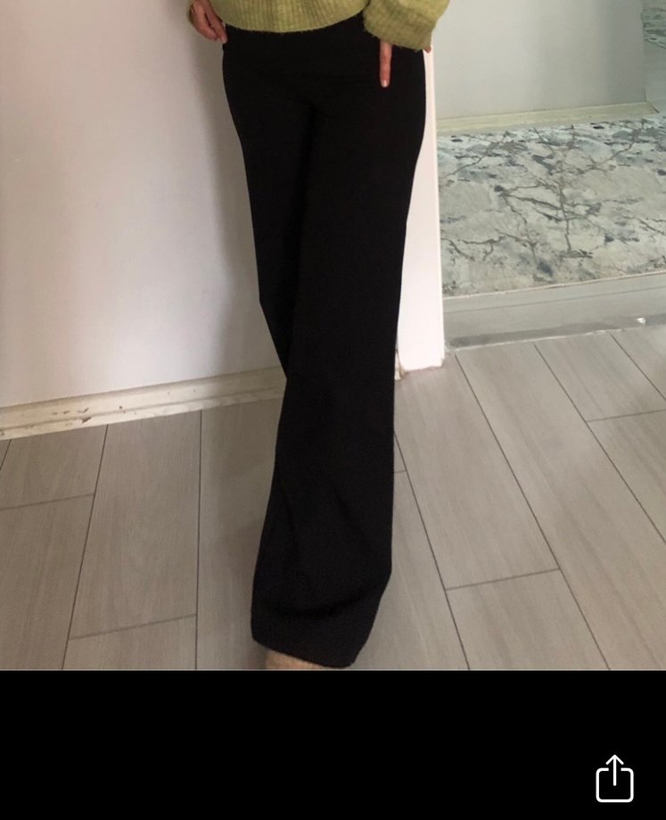 Düz siyah, normal boyda, düzenli kesim kadın kumaş pantolon. Yumuşak sentetik kumaştan, rahat ve şık sokak stili için uygun. Ürün de sadece az çok az tüylenme vardır .
