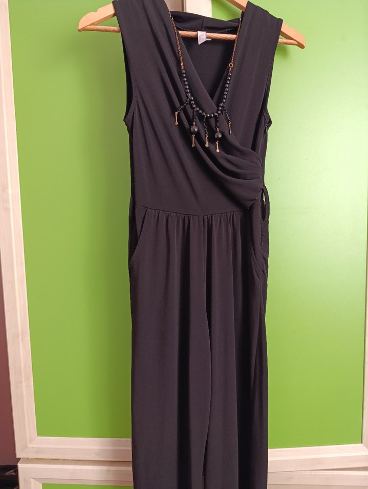 Siyah, yüksek yakalı ve kolsuz, vücuda oturan midi tulum. İpeksi dokusu ve drapeliyle avant-garde tarzına uygun. Parti için ideal. boyu 136 cm