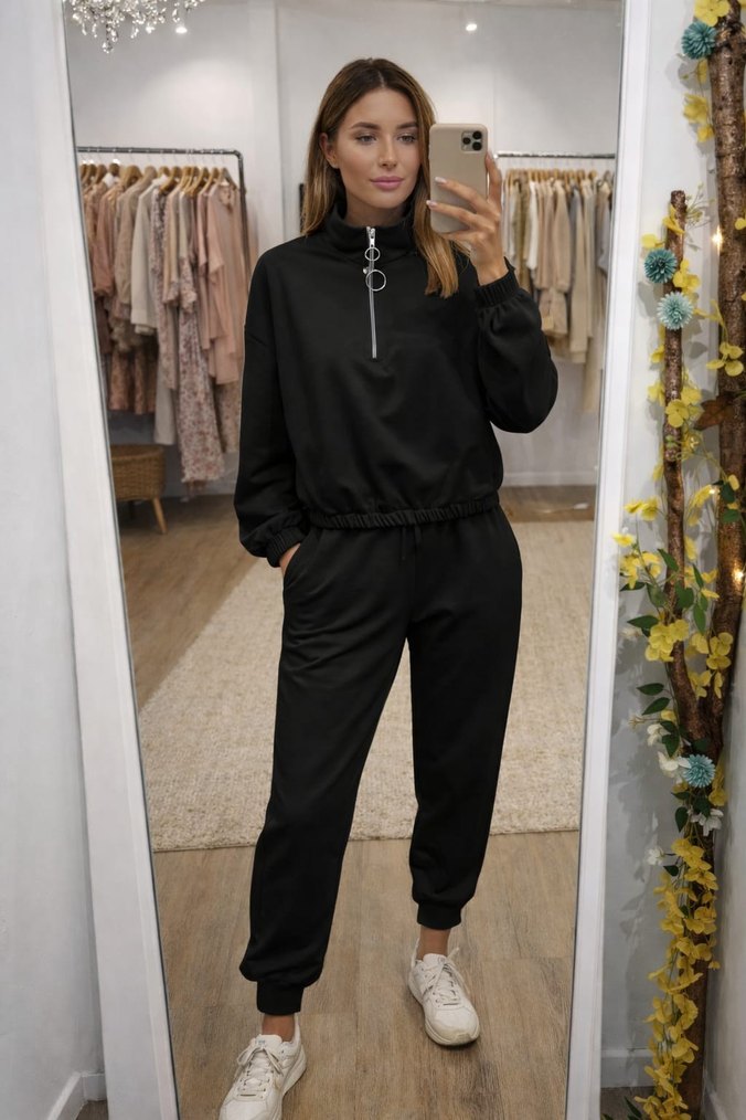Siyah renkli, yüksek yakalı ve uzun kollu kadın eşofman takımı. Rahat kesimi ve midi boyu ile günlük kullanıma uygun, şık ve rahat bir stil sunar. (L beden)
