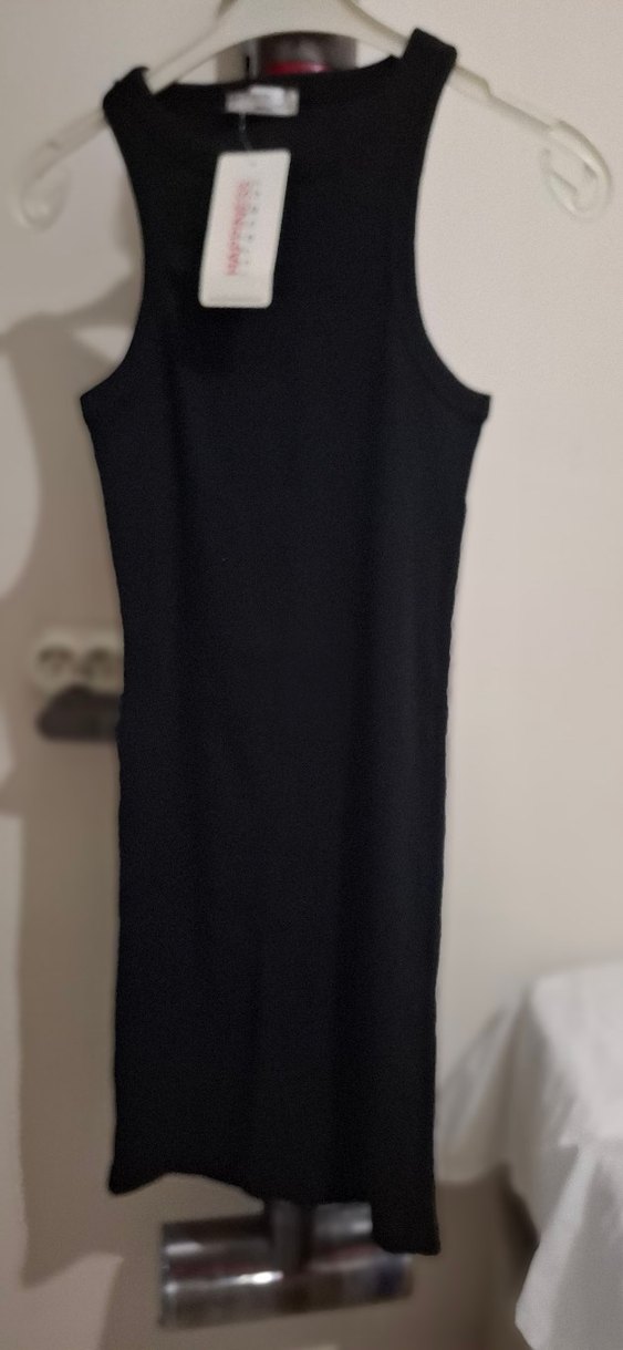 Kolsuz siyah elbise, yüksek yakalı ve vücuda oturan kesime sahiptir. Pürüzsüz sentetik kumaştan üretilmiş olup günlük kullanıma uygundur.