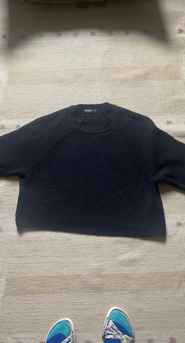 Siyah yün örme kazak, bisiklet yaka ve uzun kolludur. Salaş kesimi ve normal boyu ile günlük kullanıma uygundur. Düz ve rahat tasarıma sahiptir.
