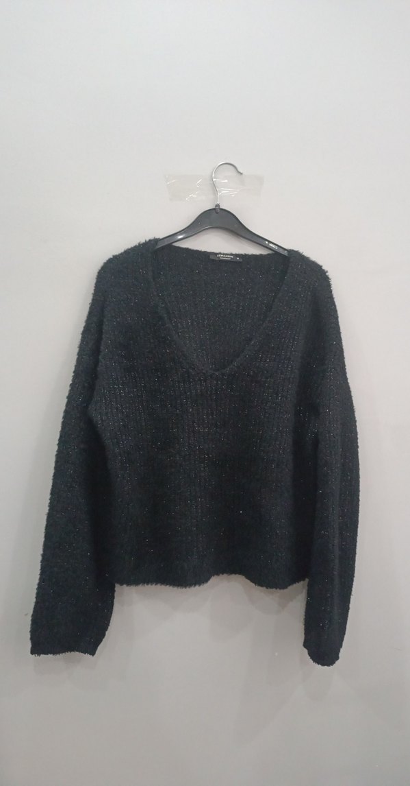 Siyah renkte, yünlü kısa kollu, kayık yaka ve bol kesim kadın triko. Cırt cırt detayı ile ofis ve sokak stiline uygun. Marka: iCW CASUAL.