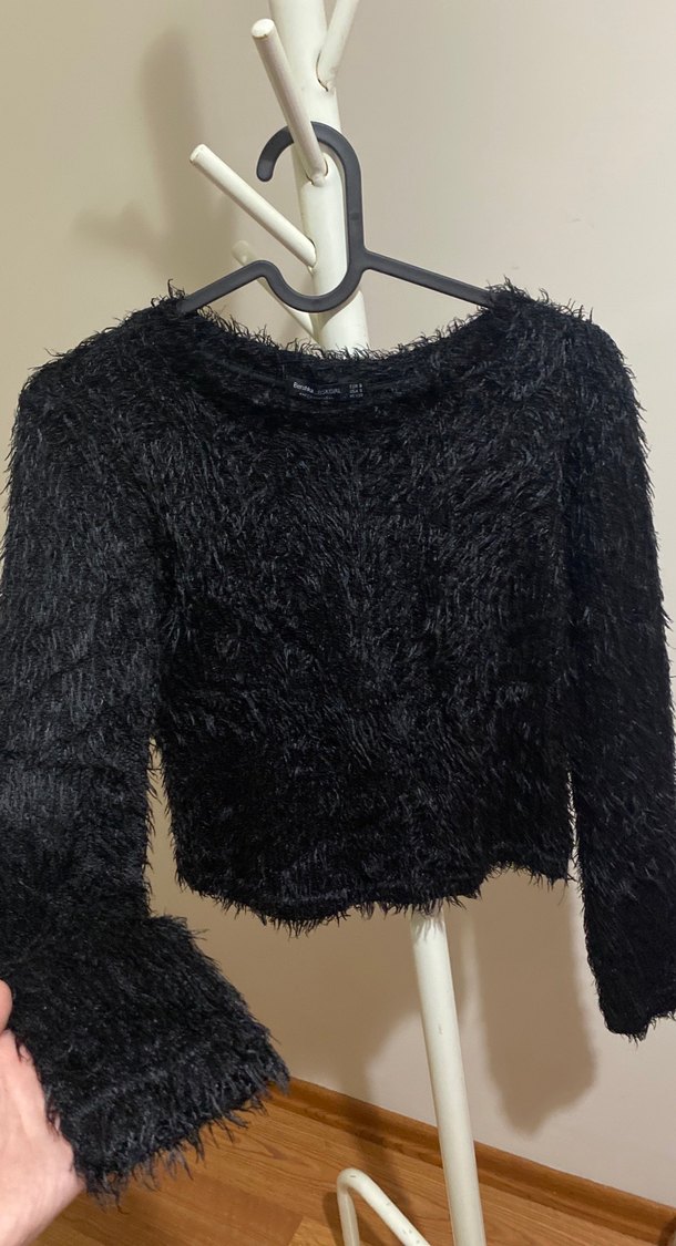 Fitted kesim siyah kadın yünlü kazak, uzun kollu ve yuvarlak yakalıdır. Yumuşak kumaşı kürklü detaylarla süslenmiştir, günlük kullanıma uygundur.