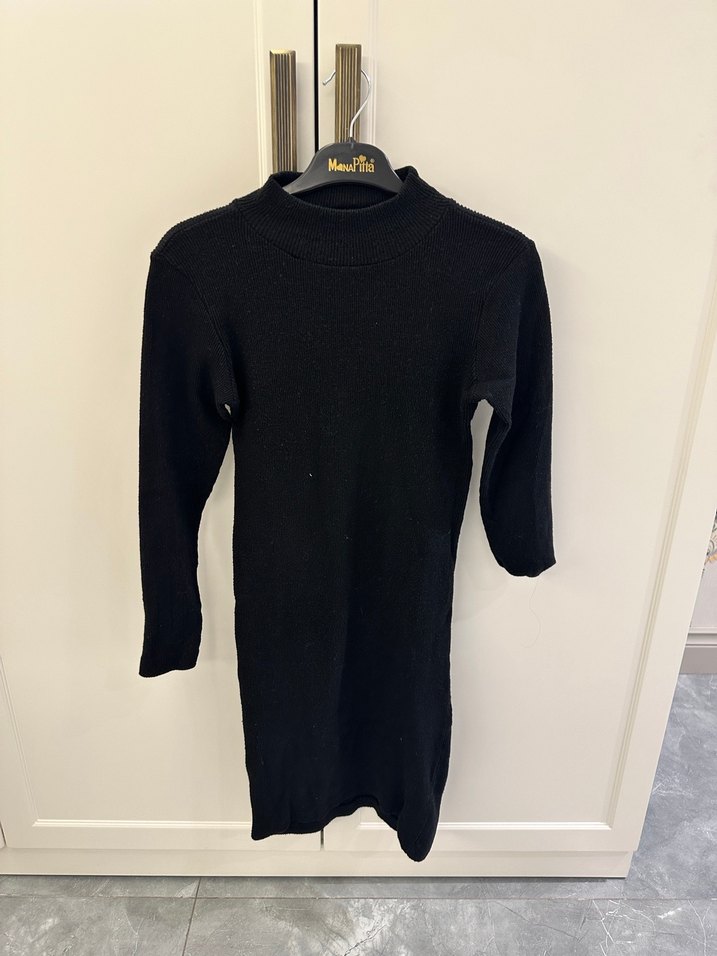 Siyah, yünlü, yüksek yakalı ve uzun kollu triko elbise. İnce kesimi ve uzun boyu günlük rahat kullanım için uygundur. Sokak stiline uyum sağlar.