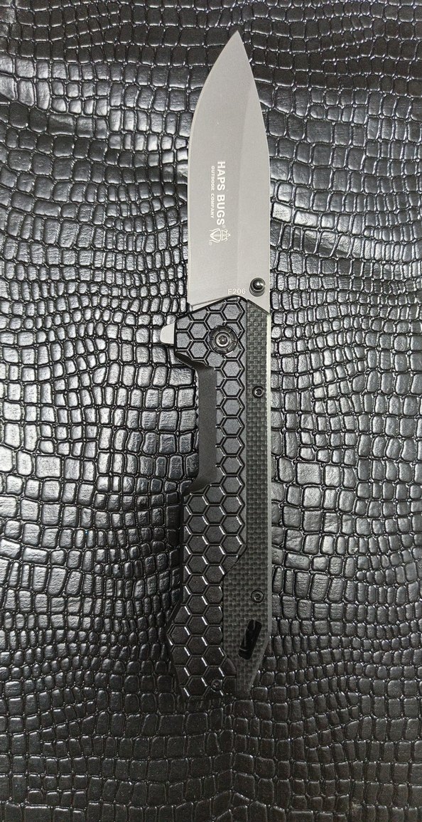 Siyah renkli, kafes desenli tutma yeri olan katlanır bıçak. Üzerinde 'HAPS BUGS' yazısı bulunur. ️