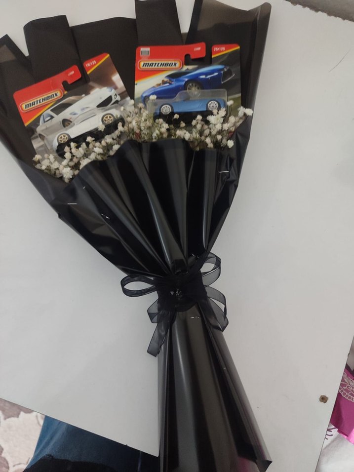 İki Matchbox oyuncak araba ve beyaz çiçeklerle süslenmiş siyah kağıtlı buket. Siyah kurdele ile bağlanmıştır.