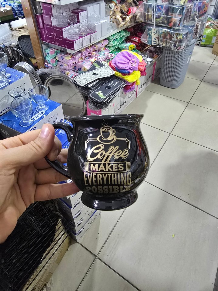 Siyah, parlak yüzeyli kahve kupasında altın renkli "Coffee makes everything possible" yazısı yer alıyor. ☕