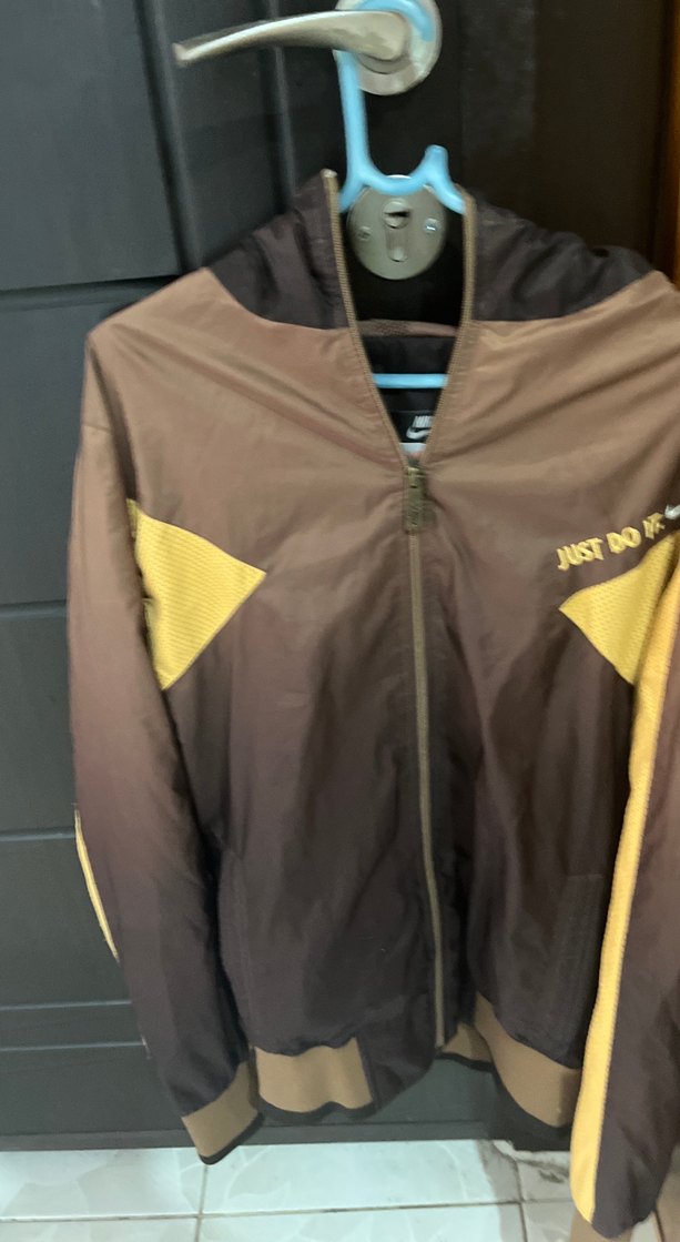Bu erkek yağmurluk, yüksek yakalı ve uzun kollu, vücuda oturan tasarıma sahiptir. Sentetik kumaştan yapılmış olup fermuarlı ve koyu kahverengi renkte, sarı detaylar içerir. "JUSTDONE" yazısı bulunur, günlük kullanıma uygundur. ️