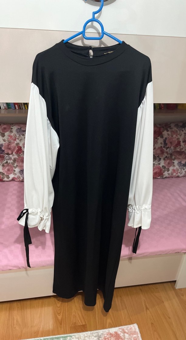 Siyah beyaz uzun kollu, kalem elbise Kolları bağlama detaylı 40-42 beden uygundur