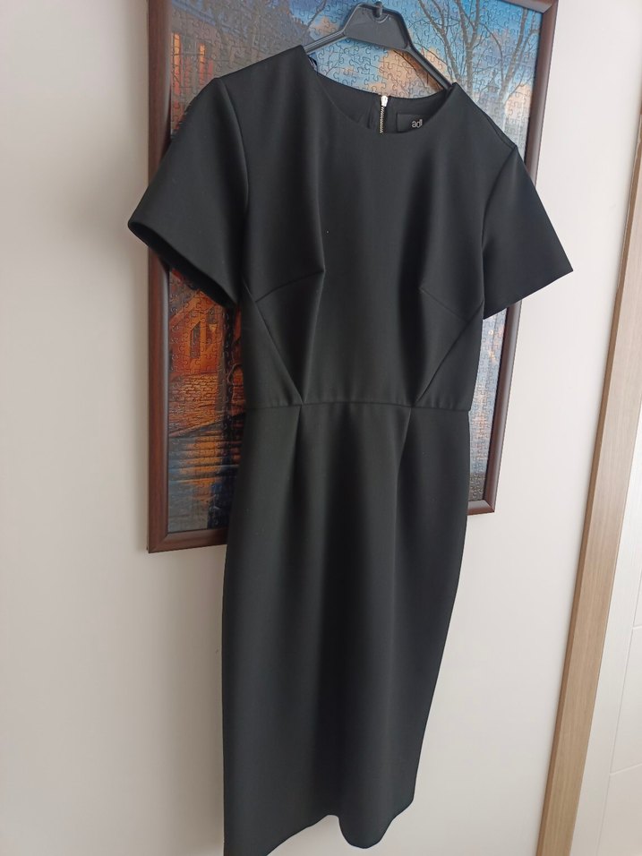 Kısa kollu siyah diz altı kalem elbise. XS ve S neden uyumlu, arkası boydan fermuarlı. Birkaç kez giyildi. İş ortamına uygun çağdaş baskılı tasarım sunar.