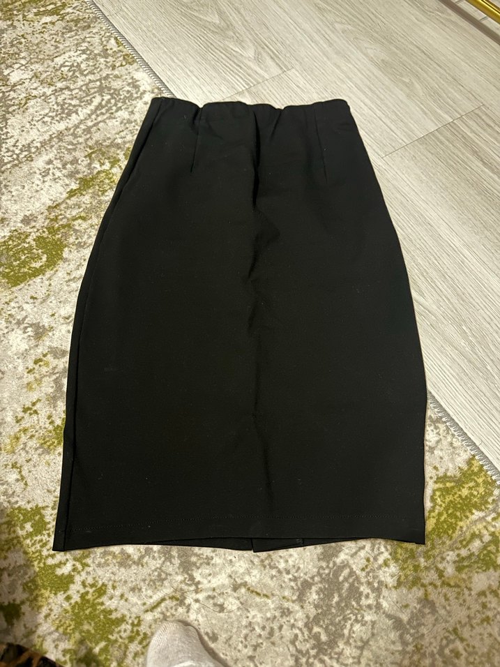 Siyah kalem etek, düz ve vücuda oturan kesimiyle ofis için sade ve şık bir tercih sunar. Sentetik kumaştan üretilmiştir.