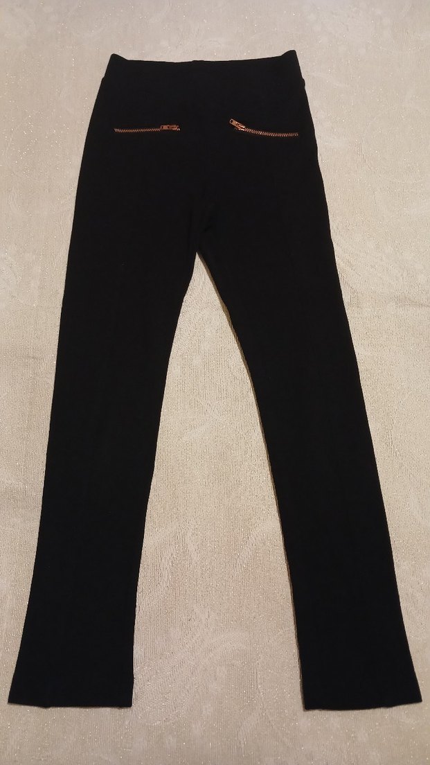 Düzenli kesim siyah kalın kumaş tayt pantolon, fermuarlı cep detayı ve yumuşak, sıcak kumaş dokusuna sahiptir. günlük kullanım için uygundur.